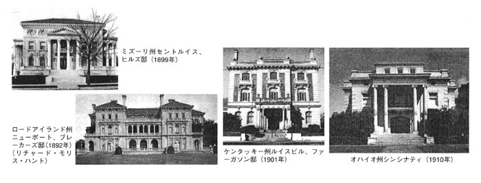 リチャード・モリス ・ ハント(1827-1895年)は、 そのエコール ・ デ・ボザールに米国から最初に留学した建築家で、その後米国の建築界をリードした。へンリー・ ホブソン・リチャードソンは、 ハーバード大学を卒業後エコール ・ デ ・ ボザールに留学した、 米国で2人目の建築家であり、 ロマネスク様式を米国に伝えた人としても知られている。 その後を追って、リチャードソンの下で慟いていたチャールズ ・ フォレン ・ マッキムと、グランドツアーでパリヘと発ったウィリアム・ラザフォード・ミードは、帰国後、パートナー事務所の構成員の一人であるスタンフォード ・ ホワイトと共に、マッキム ・ ミード・ホワイト事務所を設立し、そこでエコール・デ・ボザールの古典建築の伝統が実践された。日本からも長野宇平治、渡辺節、 村野藤吾がこの事務所に留学している。マッキム・ミード・ホワイト事務所の事業は、 アメリカンボザールやアメリカンルネッサンスとも呼ばれた。ボザール様式は、古代ローマのヴィトルビウスの「建築+書」をルネッサンス時代に復興したもので、基本的に石造建築のデザインである。左右対称形を甚本にして、柱のオーダーを中心に、建築物の全体を基本寸法の倍数と約数とで構成した、 調和のとれた比率でつくられたデザインである。建築物全体の調和と同時に、装飾として花綱飾り、盾形模様、花輪模様を建築物の壁面全体に施し、威厳のある美しさを示していることに特色があり、古代ローマ時代から現代まで、色褪せぬ審美性を維持するデザインである。